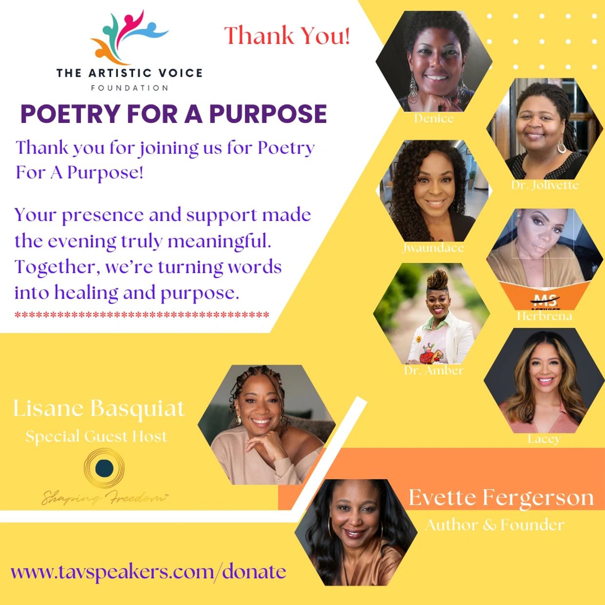 From the bottom of our hearts, thank you for joining us for Poetry for a Purpose, presented by The Artistic Voice Foundation.